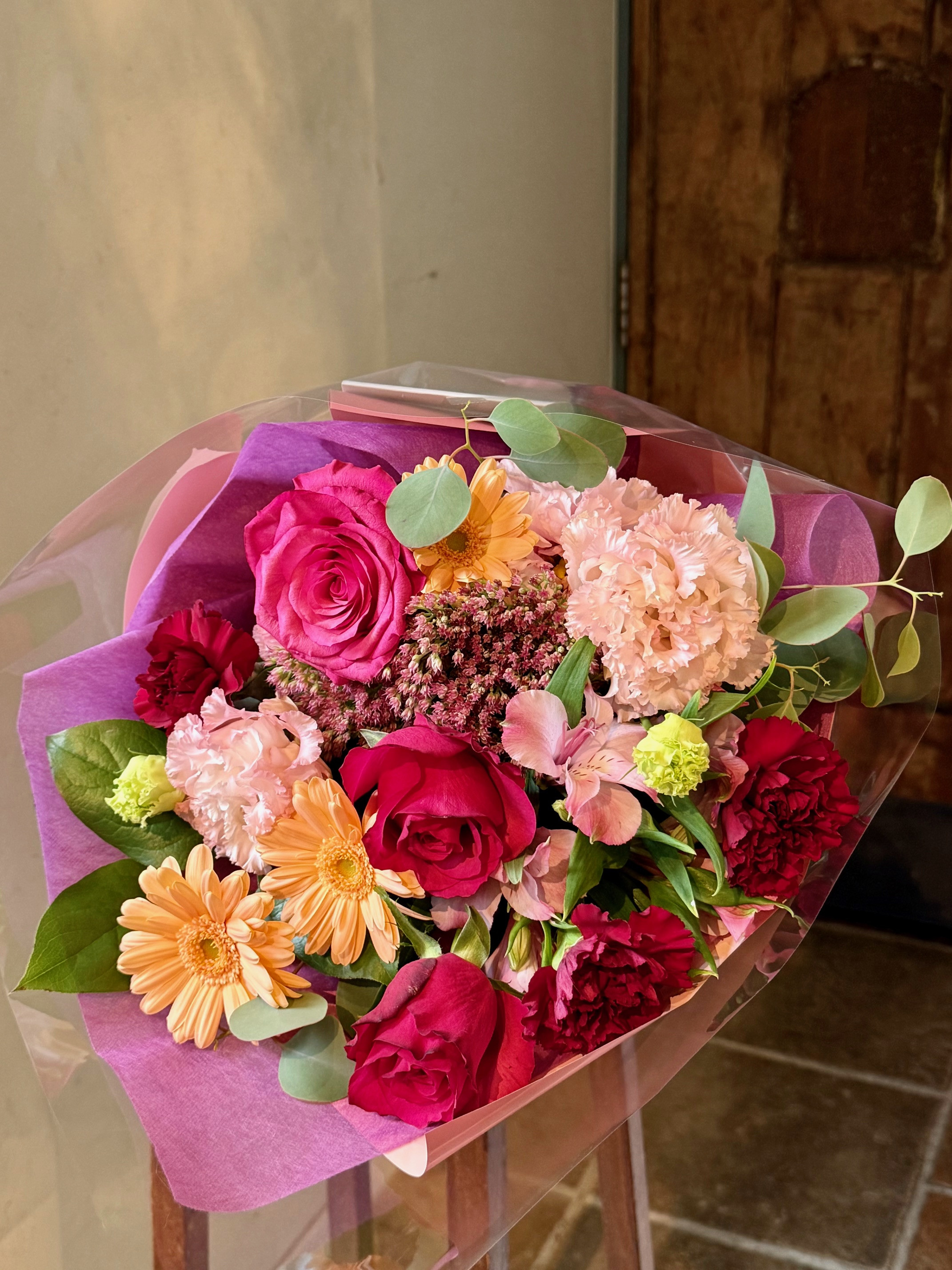 当店では、人気の赤バラの花束から、可愛らしいピンク系、ビタミンカラーのイエロー・オレンジ系など多彩な色目の花束をお作りさせていただきます。
